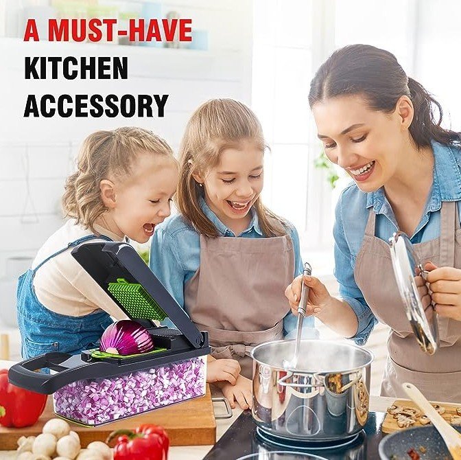 Vegetable Cutter Chopper and Slicer – A versatile all-in-one kitchen tool equipped with multiple blade attachments for slicing, dicing, shredding, and grating fruits and vegetables effortlessly.